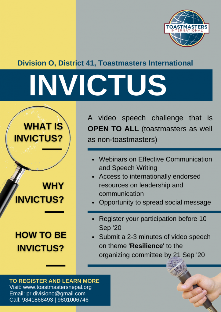 INVICTUS, by Division O, District 41, Toastmasters International, was introduced with the motive to create a platform where stories of perseverance can be shared such that we empower each other to remain strong during times of crisis. This was an open video challenge where residents of Nepal submitted a recorded video speech of 2-3 minutes on the theme Resilience. During the course of 2 months after the registrations were open and the video submissions closed, the participants also received Toastmasters International curated speech development resources and attended two webinars on the same from renowned international trainers.